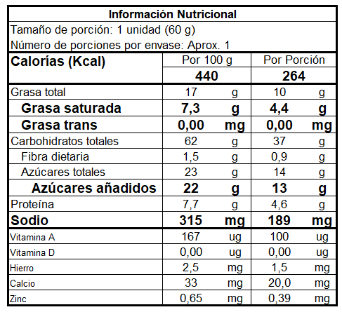 HARINA DE TRIGO (Trigo (cereal que contiene gluten), fortificado con: niacina (55 mg/Kg), hierro (44 mg/Kg), vitamina b1 (6 mg/Kg), vitamina b2 (4 mg/Kg), ácido fólico (1,44 mg/Kg), agentes para el tratamiento de harinas: alphamilasa y/o xilanasa, y/o lipasa; agentes oxidantes (ácido ascórbico y/o azodicarbonamida 1o peróxido de calcio)), MARGARINA (Mezcla de aceites y grasas comestibles, agua, y sal refinada, emulsificantes (lecitina de soya, mono y diglicéridos de ácidos grasos), conservantes (benzoato de sodio y sorbato de potasio), sinergista (ácido cítrico), aroma idéntico al natural (mantequilla y/o nata y/0 leche), colorante natural (betacaroteno) (Cl. 19575-E, 160 (i)), antioxidante TBHQ), AZUCAR, POLVO DE HORNEAR (leudante), LECHE EN POLVO, ESENCIA DE LECHE CONDESADA, SAL Y ACIDO SORBICO (conservante).