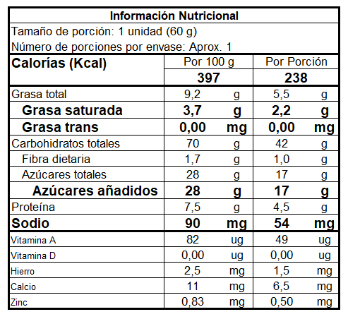HARINA DE TRIGO (Trigo (cereal que contiene gluten), fortificado con: niacina (55 mg/Kg), hierro (44 mg/Kg), vitamina b1 (6 mg/Kg), vitamina b2 (4 mg/Kg), ácido fólico (1,44 mg/Kg), agentes para el tratamiento de harinas: alphamilasa y/o xilanasa, y/o lipasa; agentes oxidantes (ácido ascórbico y/o azodicarbonamida 1o peróxido de calcio)), MARGARINA (Mezcla de aceites y grasas comestibles, agua, y sal refinada, emulsificantes (lecitina de soya, mono y diglicéridos de ácidos grasos), conservantes (benzoato de sodio y sorbato de potasio), sinergista (ácido cítrico), aroma idéntico al natural (mantequilla y/o nata y/0 leche), colorante natural (betacaroteno) (Cl. 19575-E, 160 (i)), antioxidante TBHQ), AZUCAR, POLVO DE HORNEAR (leudante), ESENCIA DE LECHE CONDENSADA Y AREQUIPE, COLOR AMARILLO, SAL Y ACIDO SORBICO (conservante).
