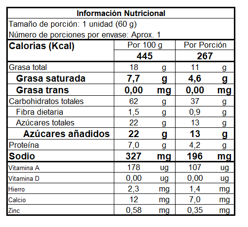 HARINA DE TRIGO (Trigo (cereal que contiene gluten), fortificado con: niacina (55 mg/Kg), hierro (44 mg/Kg), vitamina b1 (6 mg/Kg), vitamina b2 (4 mg/Kg), ácido fólico (1,44 mg/Kg), agentes para el tratamiento de harinas: alphamilasa y/o xilanasa, y/o lipasa; agentes oxidantes (ácido ascórbico y/o azodicarbonamida 1o peróxido de calcio)), MARGARINA (Mezcla de aceites y grasas comestibles, agua, y sal refinada, emulsificantes (lecitina de soya, mono y diglicéridos de ácidos grasos), conservantes (benzoato de sodio y sorbato de potasio), sinergista (ácido cítrico), aroma idéntico al natural (mantequilla y/o nata y/0 leche), colorante natural (betacaroteno) (Cl. 19575-E, 160 (i)), antioxidante TBHQ), AZUCAR, UVAS PASAS, POLVO DE HORNEAR (leudante), ESENCIA DE UVA, SAL Y ACIDO SORBICO (conservante).