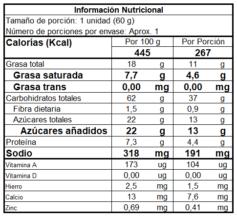HARINA DE TRIGO (Trigo (cereal que contiene gluten), fortificado con: niacina (55 mg/Kg), hierro (44 mg/Kg), vitamina b1 (6 mg/Kg), vitamina b2 (4 mg/Kg), ácido fólico (1,44 mg/Kg), agentes para el tratamiento de harinas: alphamilasa y/o xilanasa, y/o lipasa; agentes oxidantes (ácido ascórbico y/o azodicarbonamida 1o peróxido de calcio)), MARGARINA (Mezcla de aceites y grasas comestibles, agua, y sal refinada, emulsificantes (lecitina de soya, mono y diglicéridos de ácidos grasos), conservantes (benzoato de sodio y sorbato de potasio), sinergista (ácido cítrico), aroma idéntico al natural (mantequilla y/o nata y/0 leche), colorante natural (betacaroteno) (Cl. 19575-E, 160 (i)), antioxidante TBHQ), AVENA EN HOJUELAS, AZUCAR, POLVO DE HORNEAR (leudante), ESENCIA DE AREQUIPE, SAL Y ACIDO ASCORBICO (conservante).