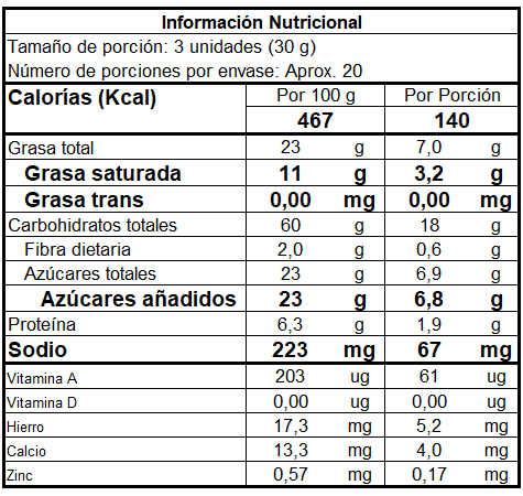 HARINA DE TRIGO (Trigo (cereal que contiene gluten), fortificado con: niacina (55 mg/Kg), hierro (44 mg/Kg), vitamina b1 (6 mg/Kg), vitamina b2 (4 mg/Kg), ácido fólico (1,44 mg/Kg), agentes para el tratamiento de harinas: alphamilasa y/o xilanasa, y/o lipasa; agentes oxidantes (ácido ascórbico y/o azodicarbonamida 1o peróxido de calcio)), MARGARINA (Mezcla de aceites y grasas comestibles, agua, y sal refinada, emulsificantes (lecitina de soya, mono y diglicéridos de ácidos grasos), conservantes (benzoato de sodio y sorbato de potasio), sinergista (ácido cítrico), aroma idéntico al natural (mantequilla y/o nata y/0 leche), colorante natural (betacaroteno) (Cl. 19575-E, 160 (i)), antioxidante TBHQ), AZUCAR, POLVO DE HORNEAR (leudante), ESENCIA DE COCO, SAL Y ACIDO ASCORBICO (conservante).