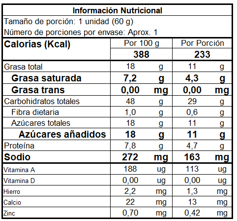HARINA DE TRIGO (Trigo (cereal que contiene gluten) fortificada con: niacina (55 mg/Kg), hierro (44 mg/Kg), vitamina b1 (6 mg/Kg), vitamina b2 (4 mg/Kg), acido folico (1,44 mg/Kg). agentes para el tratamiento de harina: alphamilasa y/o xilanasa, y/o lipasa; agentes oxidantes (acido ascórbico y/o azodicarbonamida 1 o peroxido de calcio)), MARGARINA (Mezcla de aceites y grasas comestibles, agua y sal refinada, emulsificantes (lecitina de soya, mono y diglicéridos de ácidos grasos). conservantes (benzoato de sodio y sorbato de potasio), sinergista (ácido cítrico), aroma idéntico al natural (mantequilla y/o nata y/o leche), colorante natural (betacaroteno) (Cl. 19575-E, 160 (i)). antioxidante (TBHQ), HUEVOS, AZUCAR, POLVO DE HORNEAR (leudante), ESENCIA DE AREQUIPE, SAL, ACIDO SORBICO (conservante) Y SORBATO DE POTASIO.