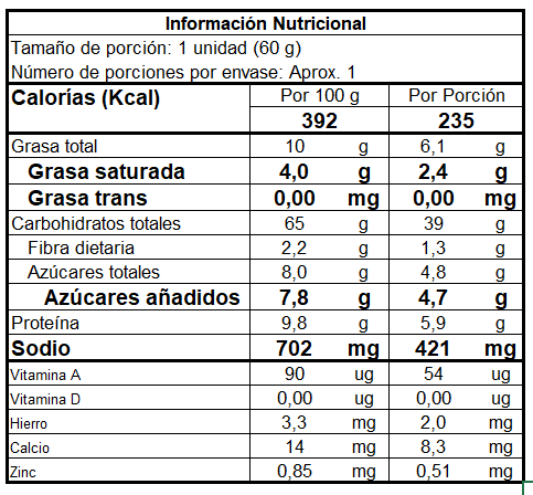 HARINA DE TRIGO (Trigo (cereal que contiene gluten), fortificado con: niacina (55 mg/Kg), hierro (44 mg/Kg), vitamina b1 (6 mg/Kg), vitamina b2 (4 mg/Kg), ácido fólico (1,44 mg/Kg), agentes para el tratamiento de harinas: alphamilasa y/o xilanasa, y/o lipasa; agentes oxidantes (ácido ascórbico y/o azodicarbonamida 1o peróxido de calcio)), AGUA, MARGARINA (Mezcla de aceites y grasas comestibles, agua, y sal refinada, emulsificantes (lecitina de soya, mono y diglicéridos de ácidos grasos), conservantes (benzoato de sodio y sorbato de potasio), sinergista (ácido cítrico), aroma idéntico al natural (mantequilla y/o nata y/0 leche), colorante natural (betacaroteno) (Cl. 19575-E, 160 (i)), antioxidante TBHQ), AZUCAR, SAL, LEVADURA (leudante), ESENCIA NATAS (saborizante artificial) Y PROPIONATO DE CALCIO (conservante).