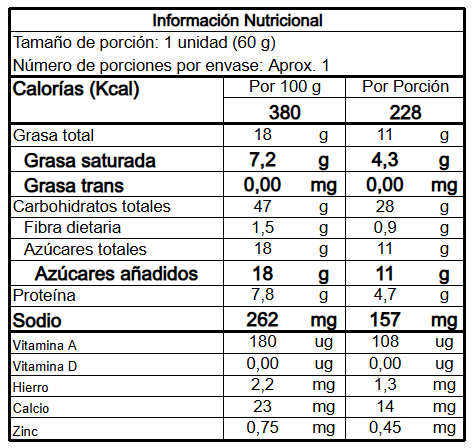 HARINA DE TRIGO (Trigo (cereal que contiene gluten), fortificado con: niacina (55 mg/Kg), hierro (44 mg/Kg), vitamina b1 (6 mg/Kg), vitamina b2 (4 mg/Kg), ácido fólico (1,44 mg/Kg), agentes para el tratamiento de harinas: alphamilasa y/o xilanasa, y/o lipasa; agentes oxidantes (ácido ascórbico y/o azodicarbonamida 1o peróxido de calcio)), MARGARINA (Mezcla de aceites y grasas comestibles, agua, y sal refinada, emulsificantes (lecitina de soya, mono y diglicéridos de ácidos grasos), conservantes (benzoato de sodio y sorbato de potasio), sinergista (ácido cítrico), aroma idéntico al natural (mantequilla y/o nata y/0 leche), colorante natural (betacaroteno) (Cl. 19575-E, 160 (i)), antioxidante TBHQ), HUEVOS, AZUCAR, POLVO DE HORNEAR (leudante), ESENCIA DE VAINILLA, SAL, ACIDO SÓRBICO (conservante) Y SORBATO DE POTASIO.